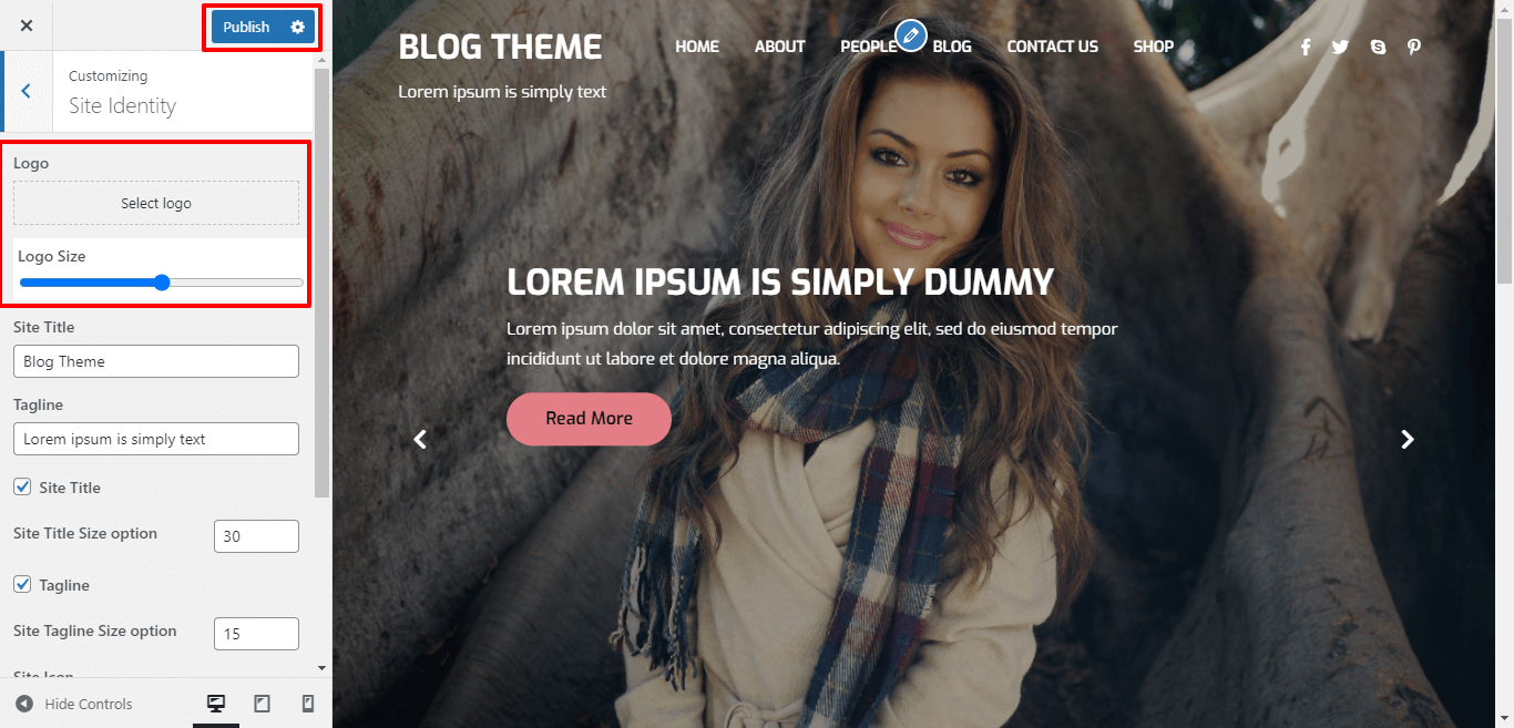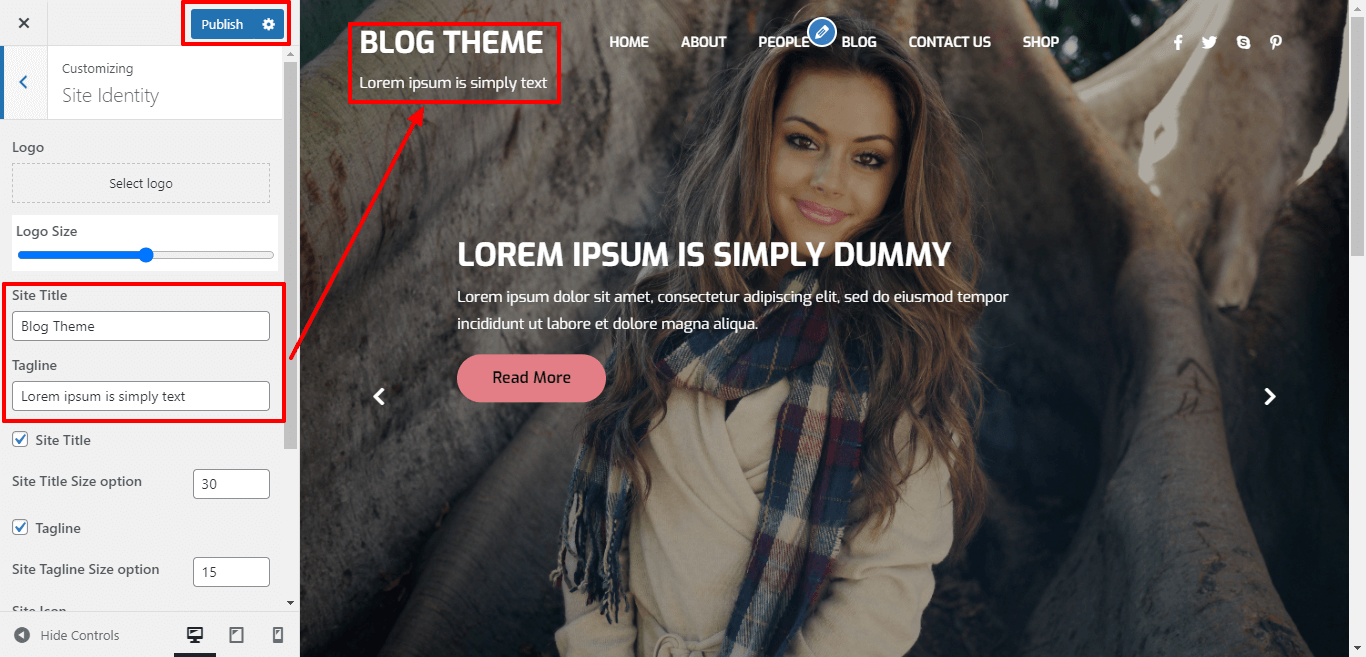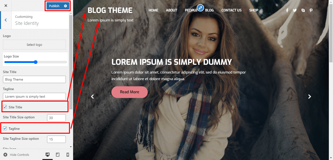 For show / hide site title and tagline for the theme, click on the checkbox for the theme.