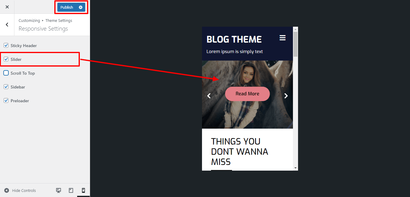 For Enable / Disable slider for mobile device or responsive media click on checkbox .