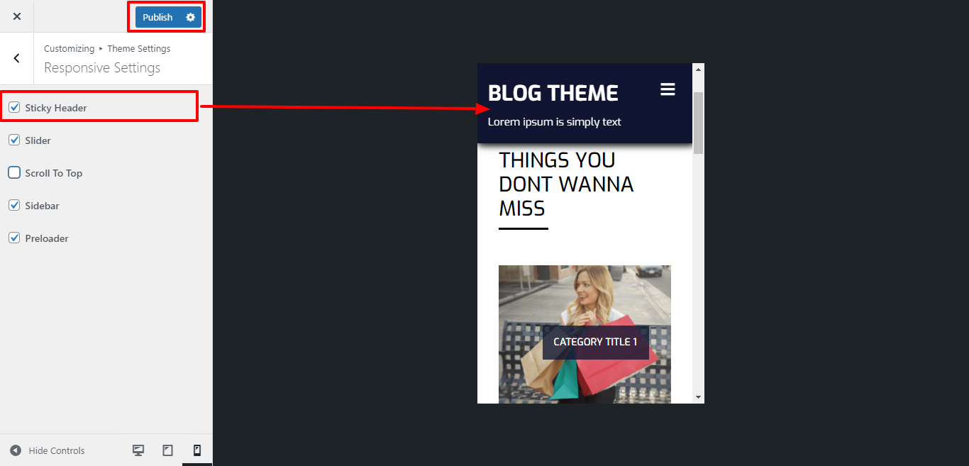 For Enable / Disable stick-header for mobile device or responsive media click on checkbox .