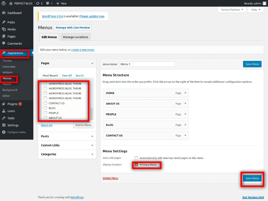 Once you have create menu. You need to add pages by selecting with checkboxes. After adding menu list you can arrange it by drag and drop.
