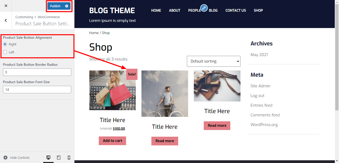 Go to Appearance >> Customize >> Woocommerce >> Product Sale Button Settings