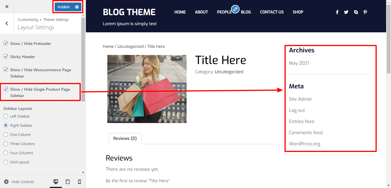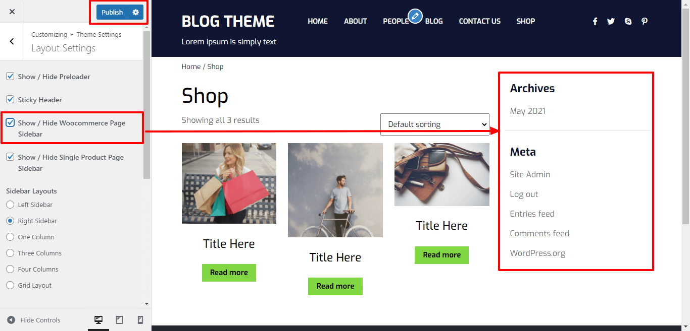 In Layout Settings, Here You can click the checkebox if you want to show / hide woocommerce page sidebar.