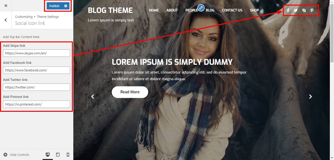 Go to Appearance >> Customize >> Themes Settings>> Social Icon Link