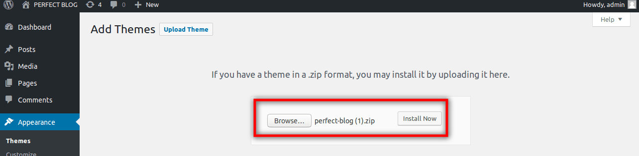 You will be prompted to choose the zip file that you downloaded earlier. Select the file and click Install Now.
