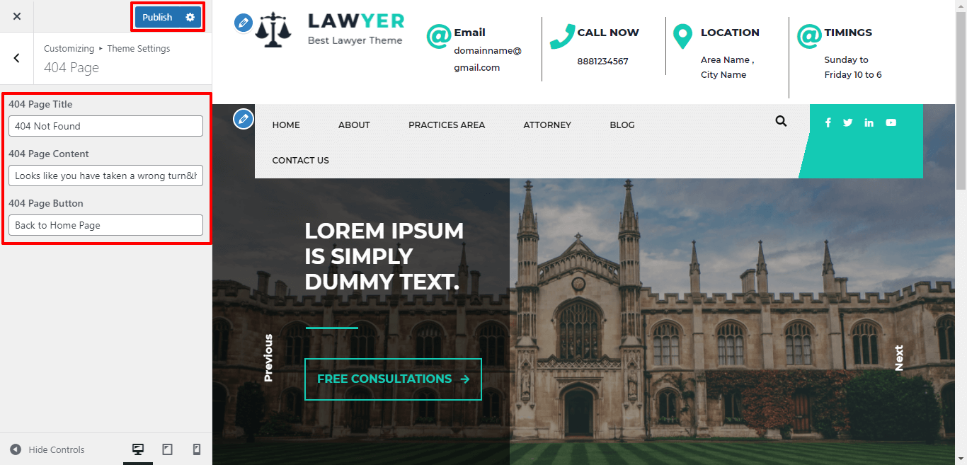 Go to Appearance >> Customize >> Themes Settings >> 404 Page