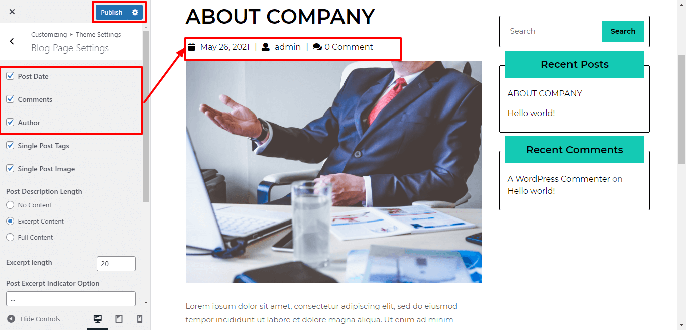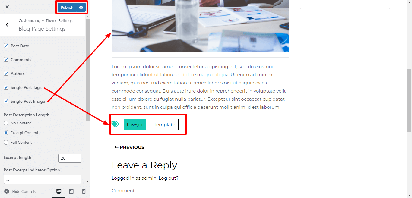 For show / hide single post tags and single post image, click on the checkbox for the theme.