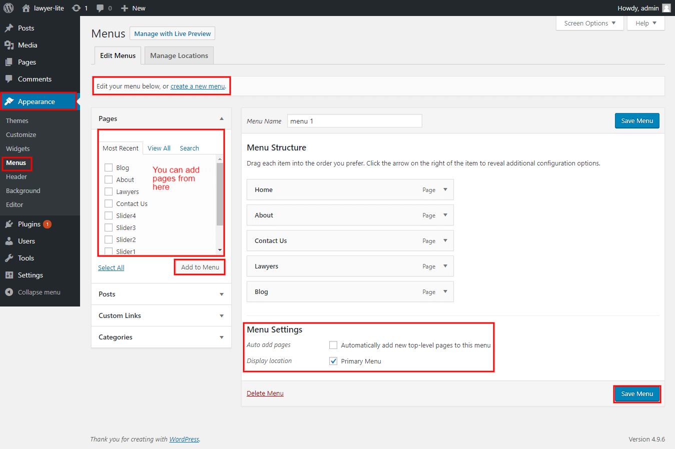 Once you have create menu. You need to add pages by selecting with checkboxes. After adding menu list you can arrange it by drag and drop.