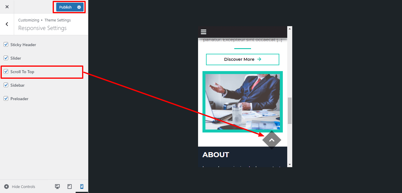 For Enable / Disable scroll to top for mobile device or responsive media click on checkbox .