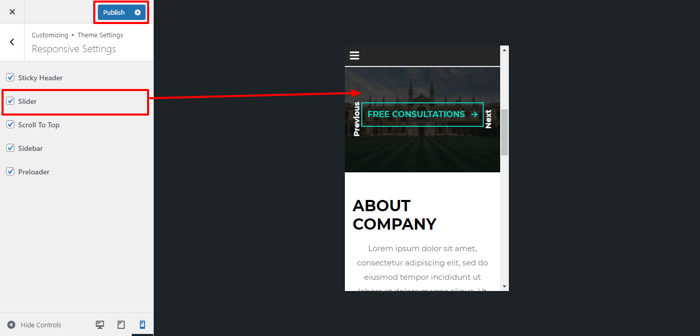 For Enable / Disable slider for mobile device or responsive media click on checkbox .