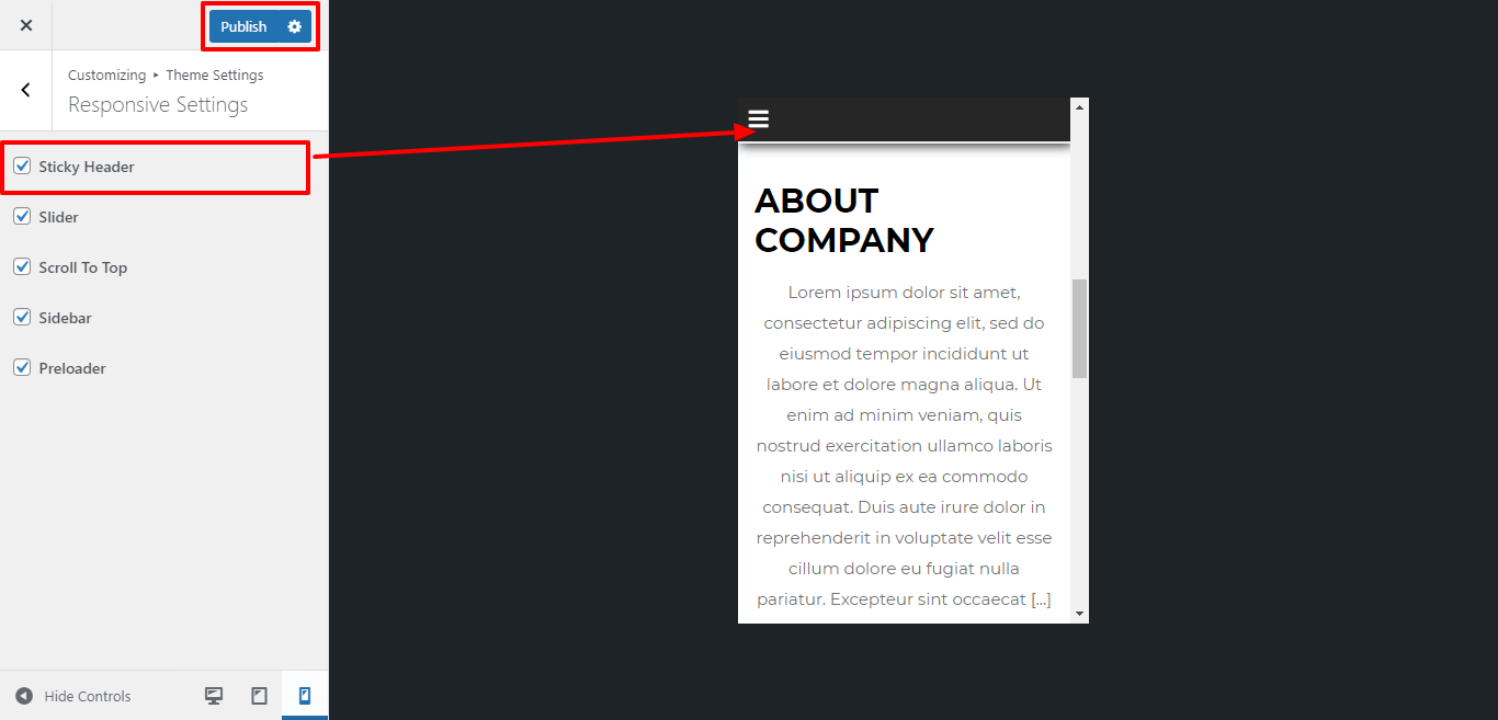 For Enable / Disable stick-header for mobile device or responsive media click on checkbox .