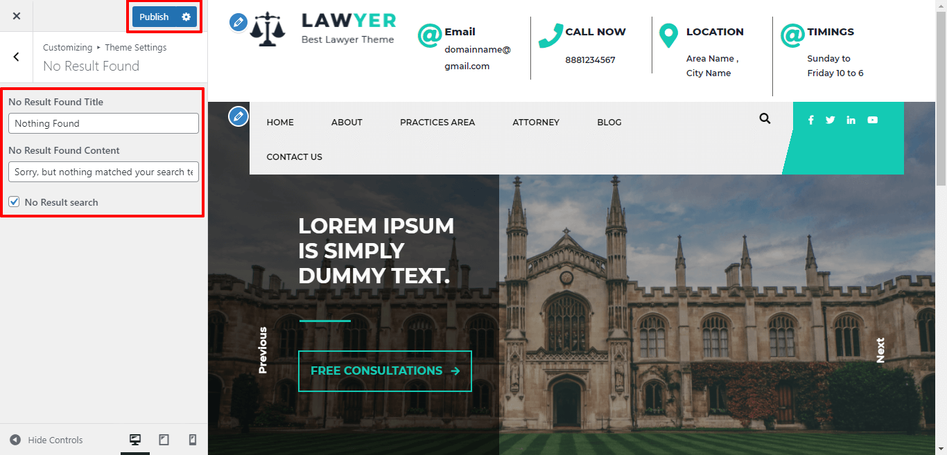 Go to Appearance >> Customize >> Themes Settings >> No Result Found