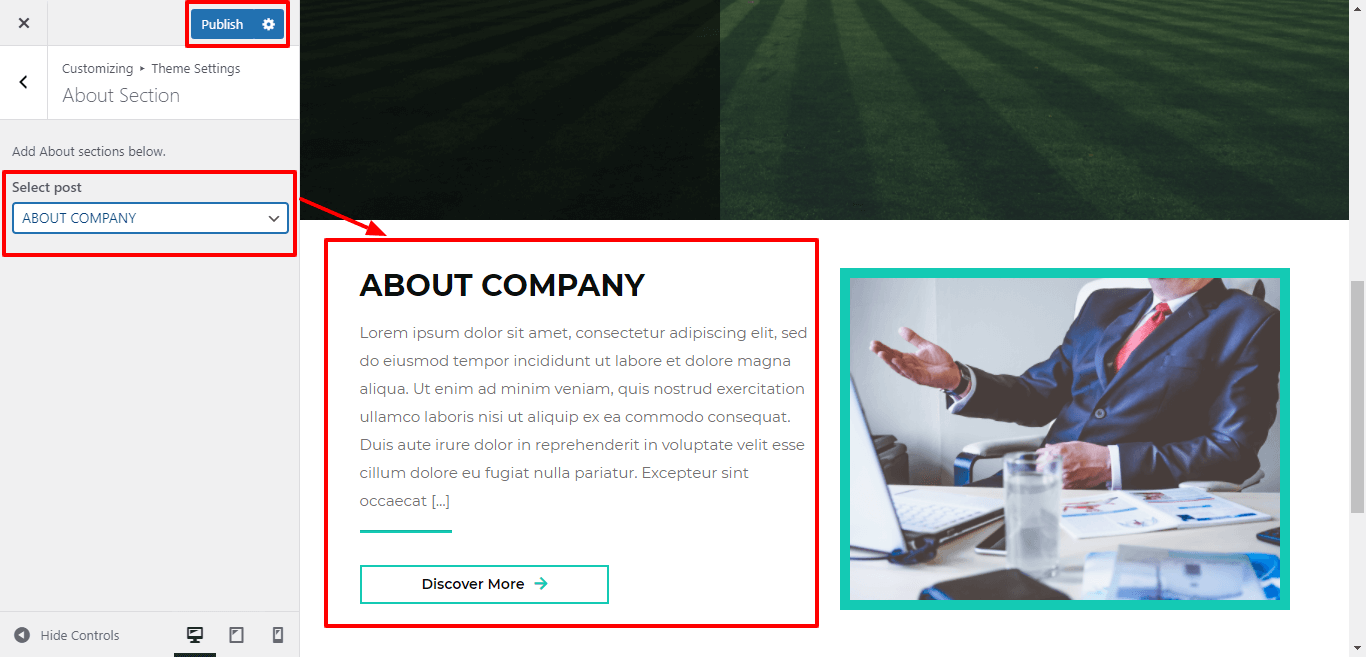 Go to Appearance >> Customize >> Theme Settings >> About Section