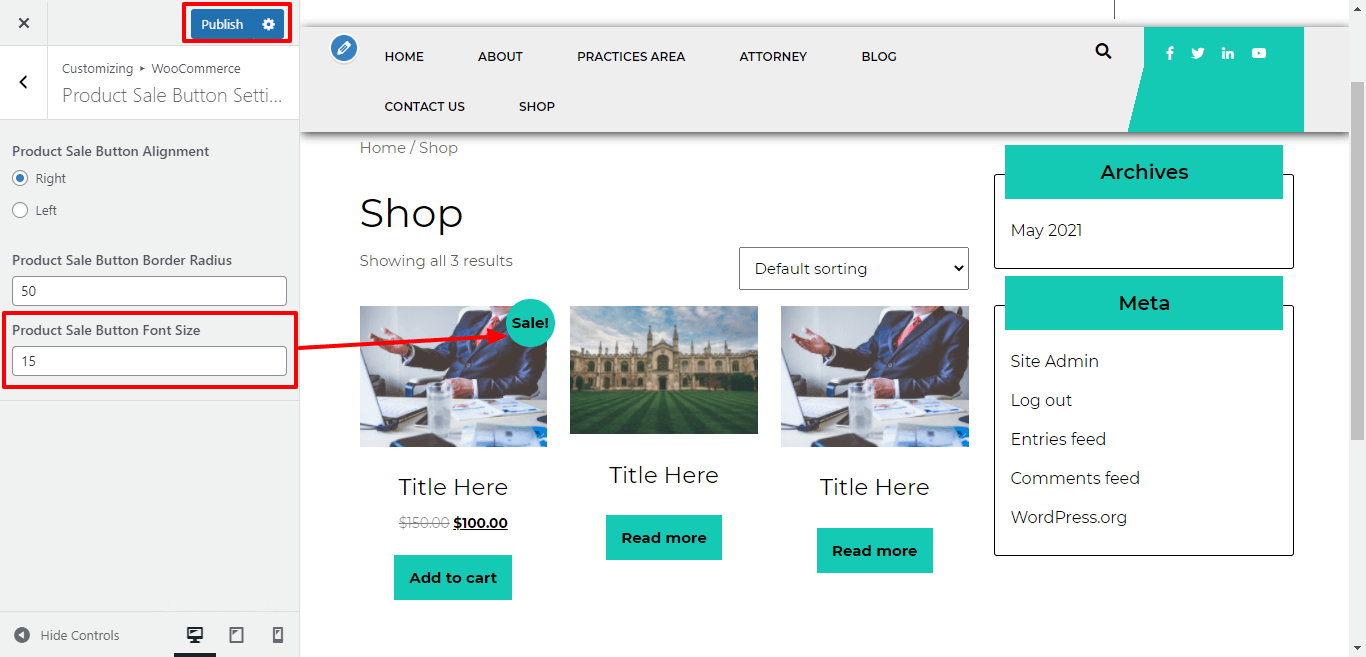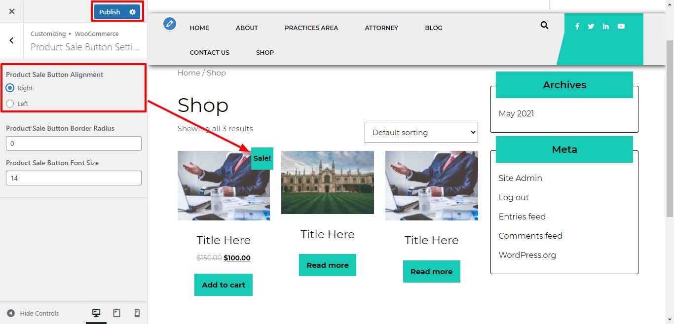 Go to Appearance >> Customize >> Woocommerce >> Product Sale Button Settings