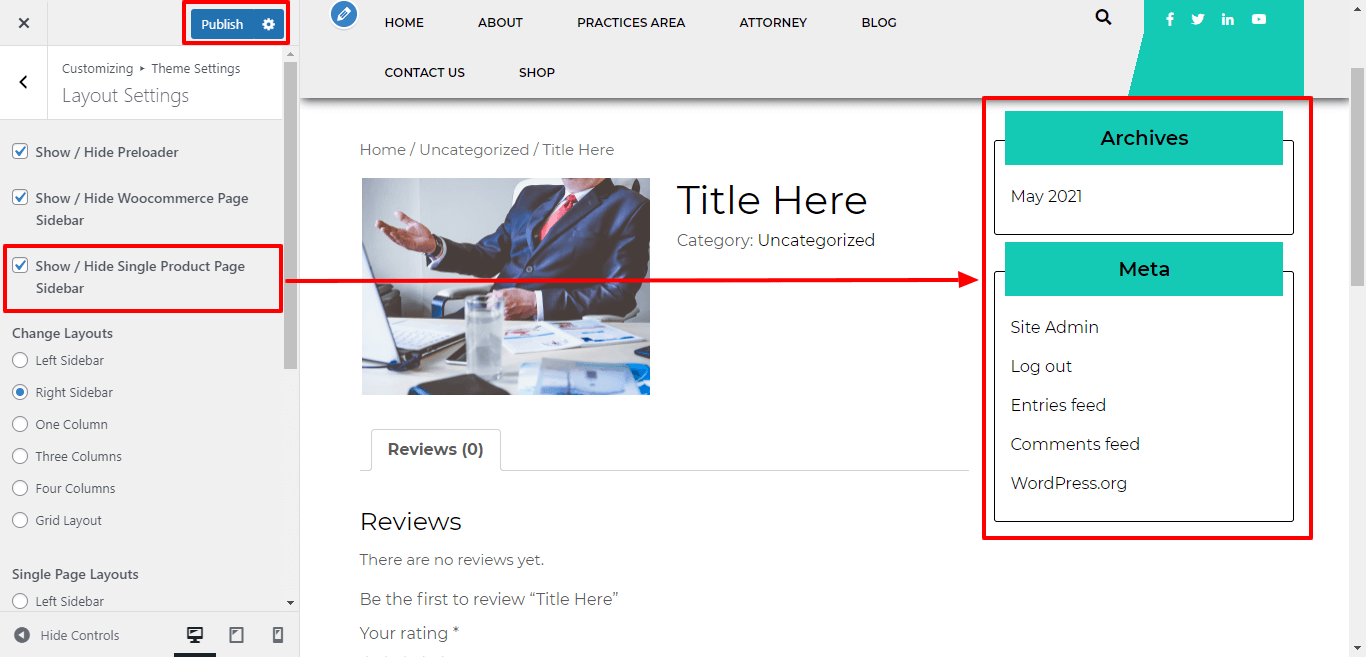 In Layout Settings, Here You can click the checkebox if you want to show / hide single product page sidebar.