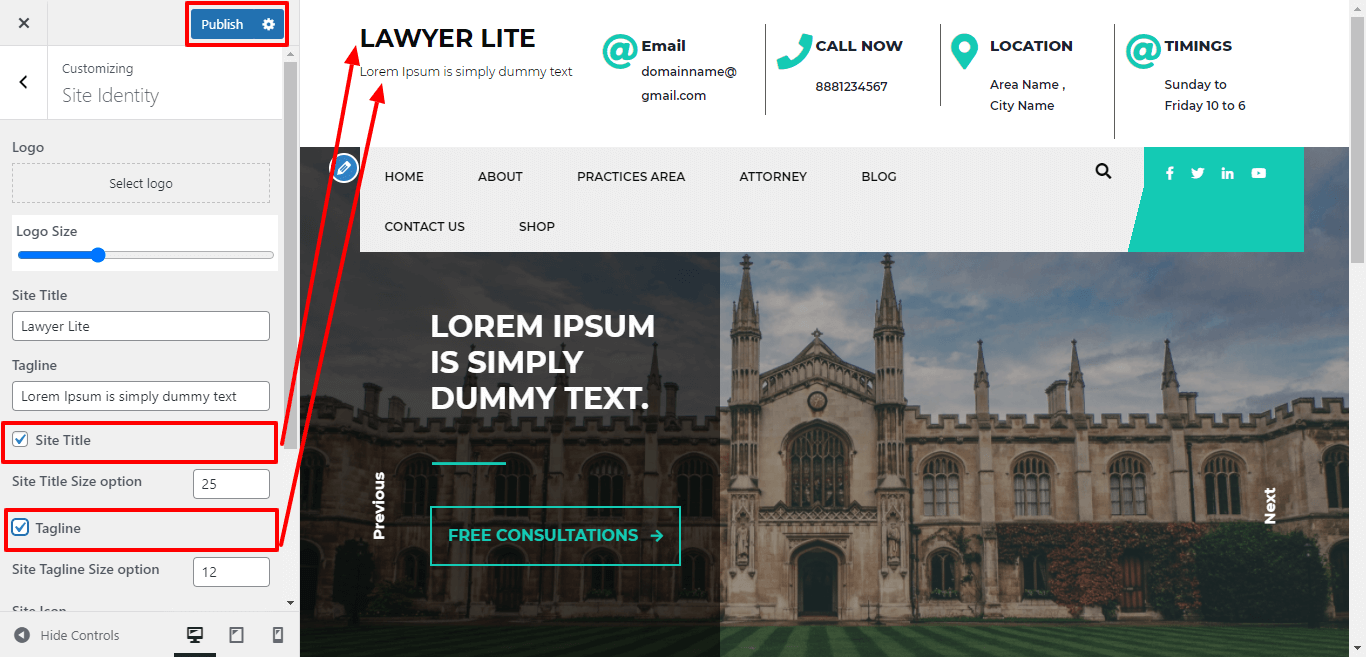 For show / hide site title and tagline for the theme, click on the checkbox for the theme.
