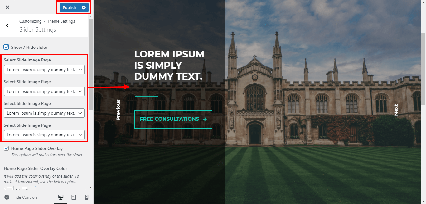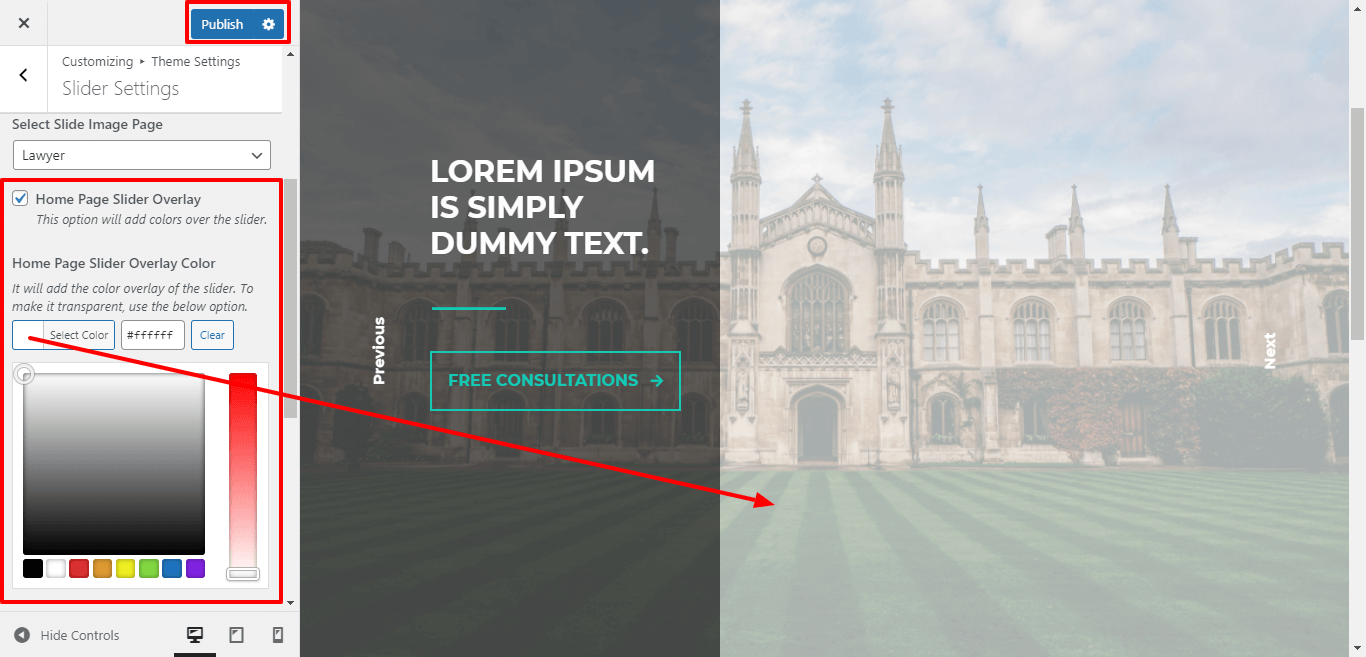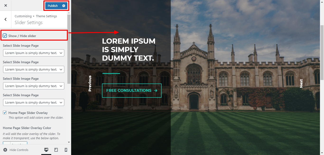 Here You can select show / hide slider image overlay and select the Background color, for Slider Image display transparent.