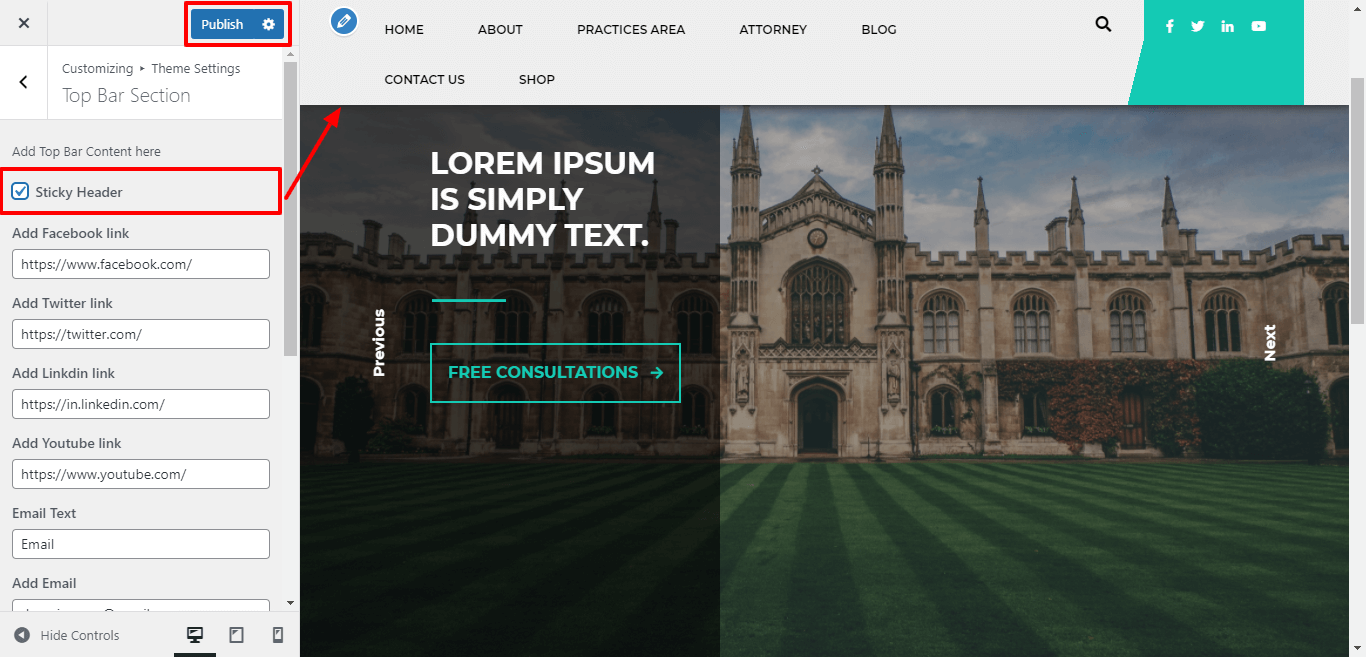Go to Appearance >> Customize >> Themes Settings >> Topbar Section