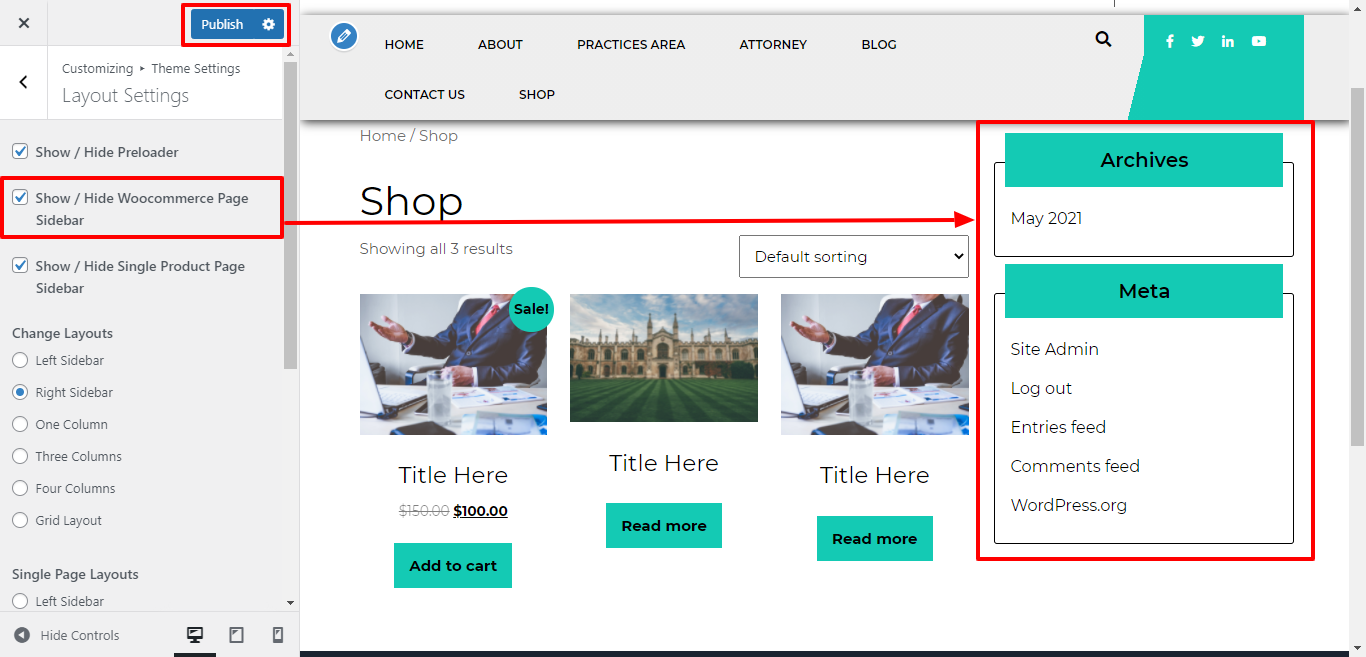 In Layout Settings, Here You can click the checkebox if you want to show / hide woocommerce page sidebar.