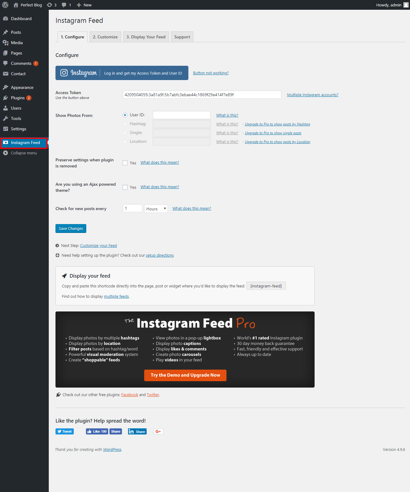 When logging in and saving your changes, you will see the Instagram shortcode. i.e [instagram].