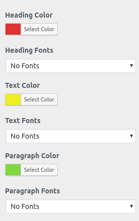 Depending on the number of options accessible in each section, there is an option to change the colour scheme for the headings, title/text, paragraph, button text, and button background.