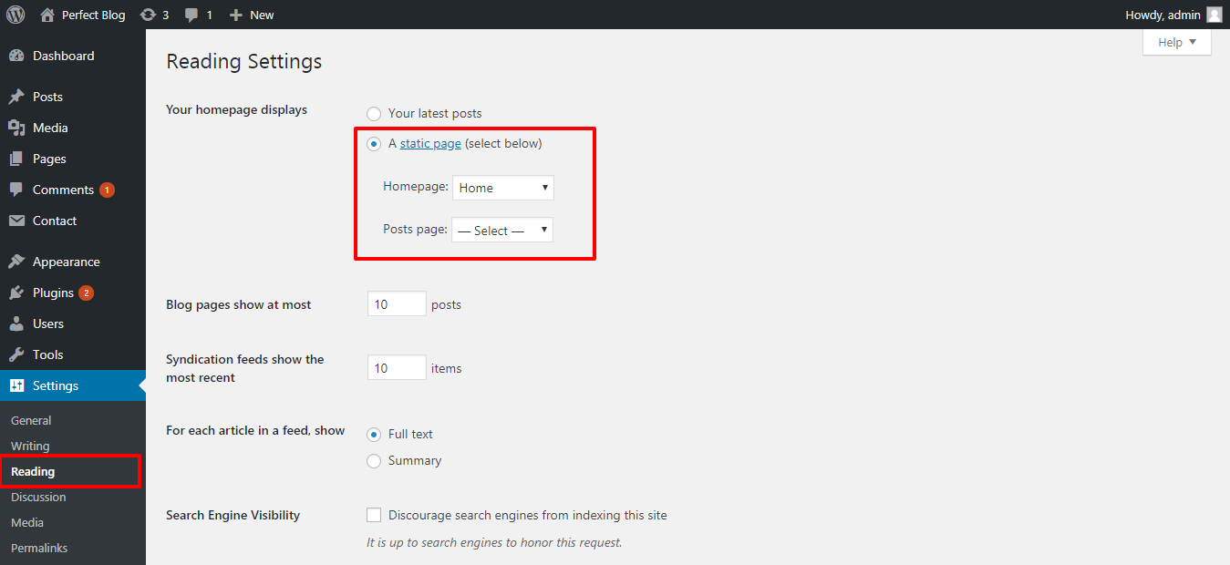 2. Set the front page: Go to Setting -> Reading --> Set the home page as the front page display static page.