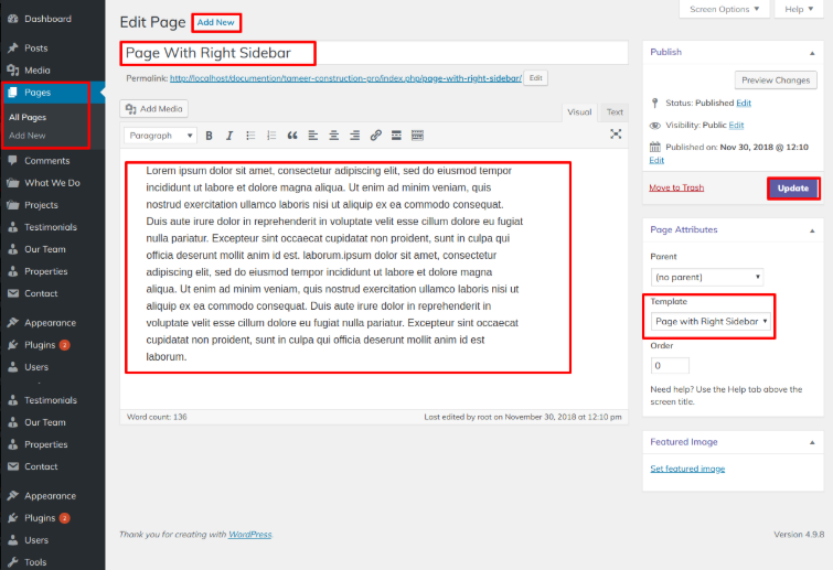 1. Go to Dashboard Pages Add New Page, enter page name and select template as Home Page Template from Page Attribute as shown in below image