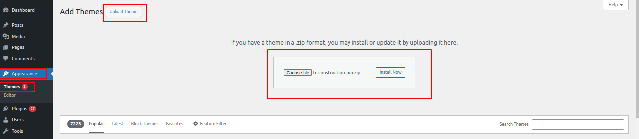 Click on Browse Button then select your tc-construction-pro.zip theme and click on Install Now Button..