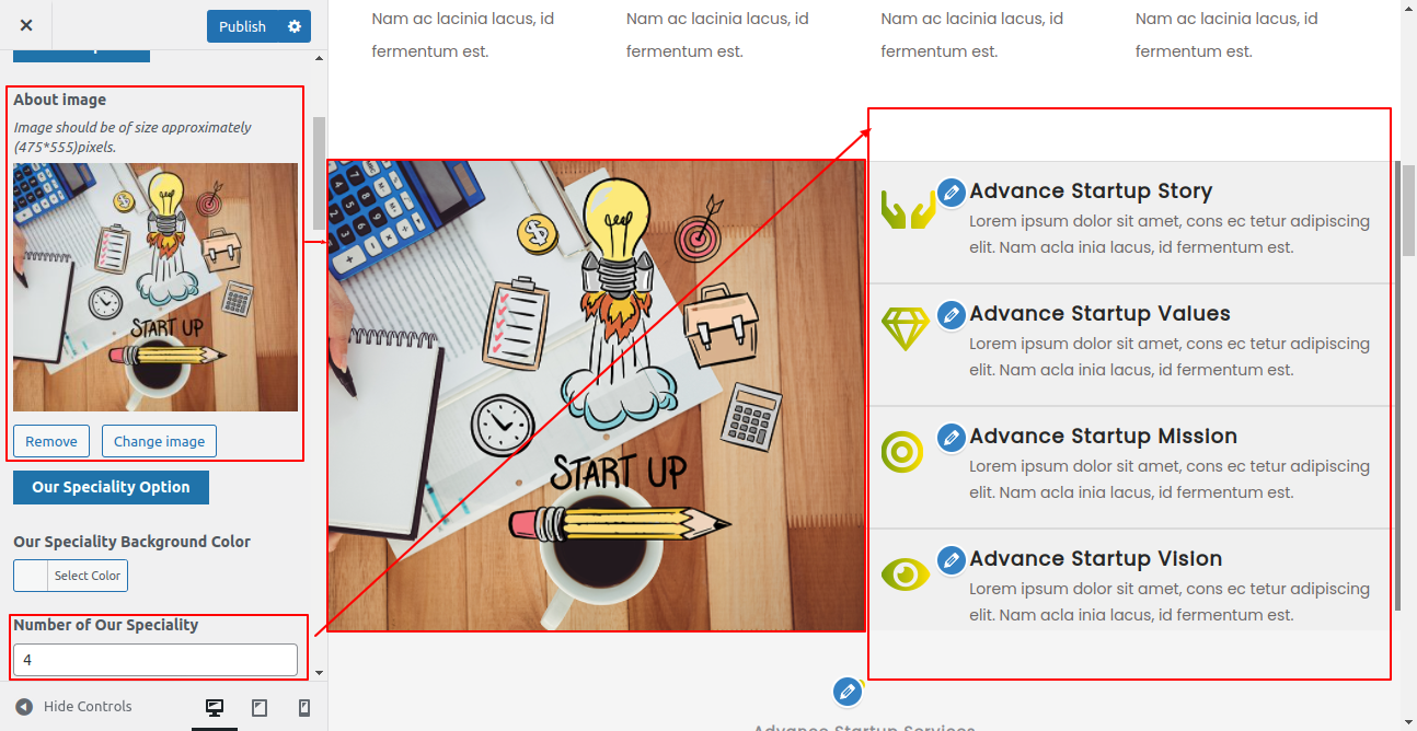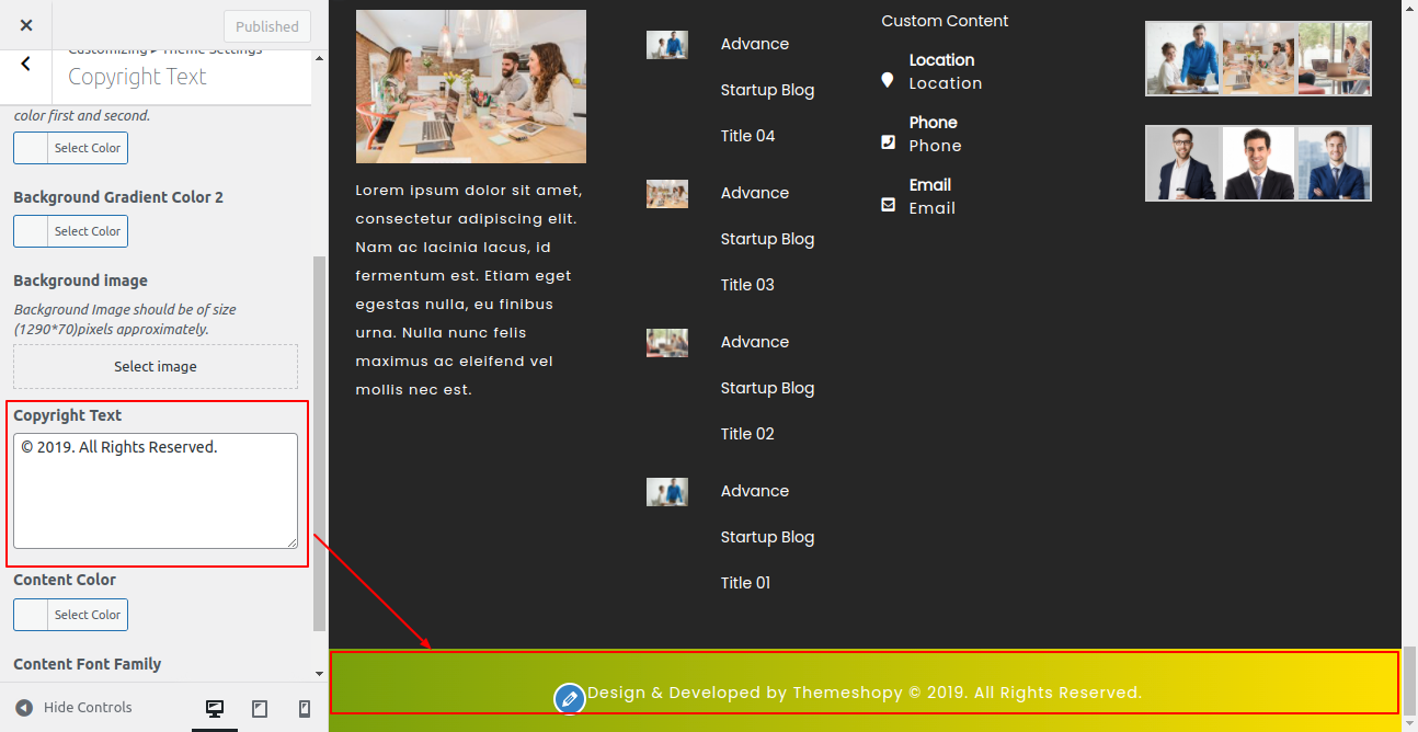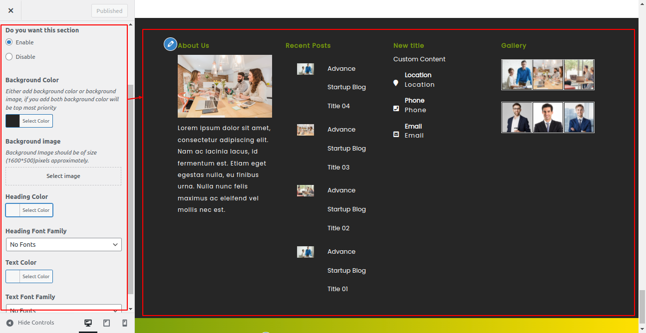 To reorder an area simply means to arrange it according to our needs. Drag the section to the top or bottom as necessary to continue with this part. Your front view will alter in accordance with customizer values when you drag any section to the top or bottom.