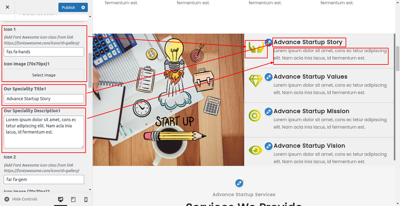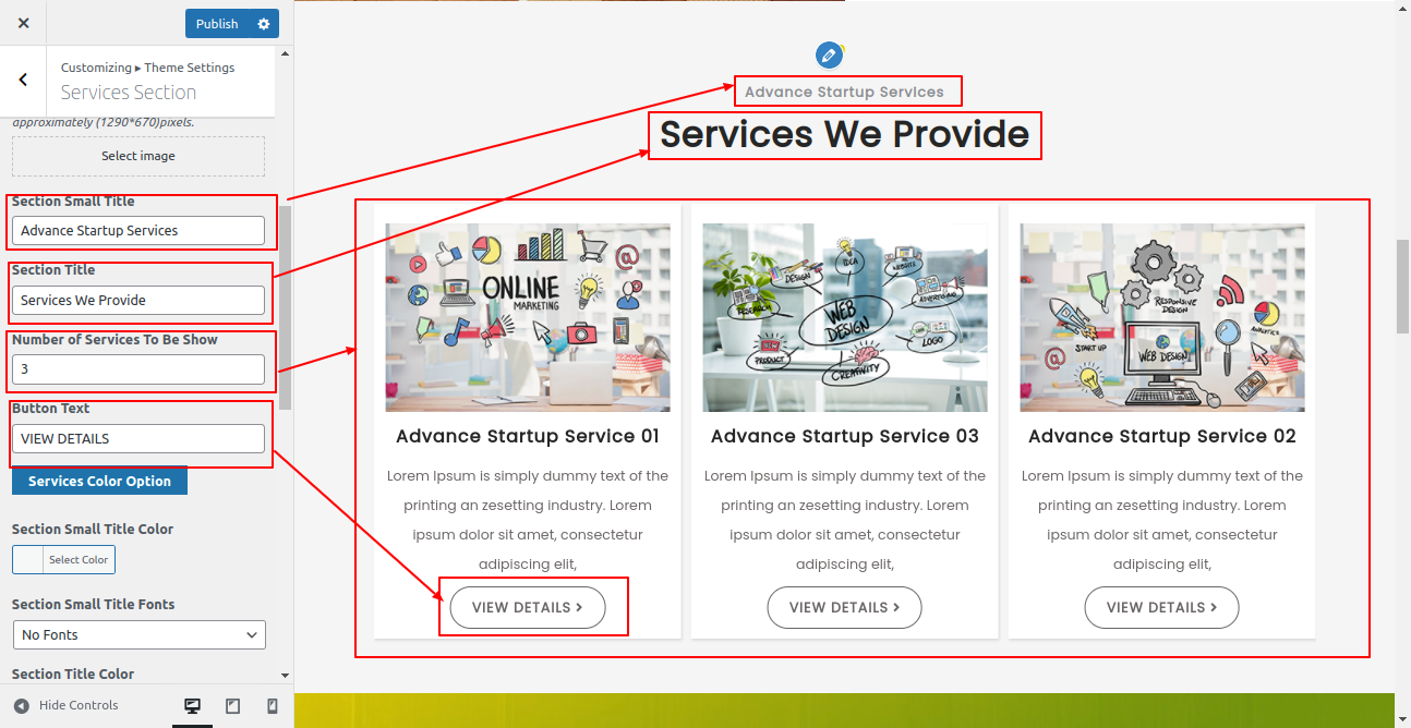 Go to Appearance >> Customize >> Theme Settings >> our Services .