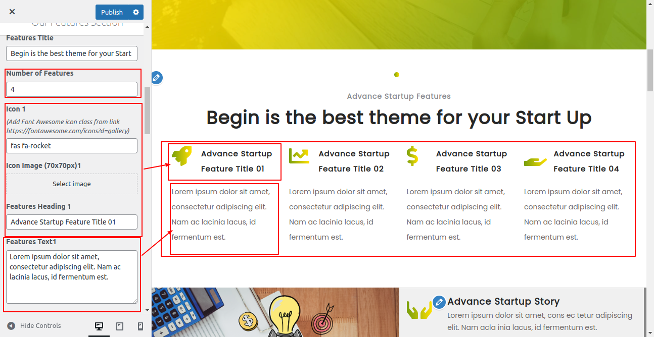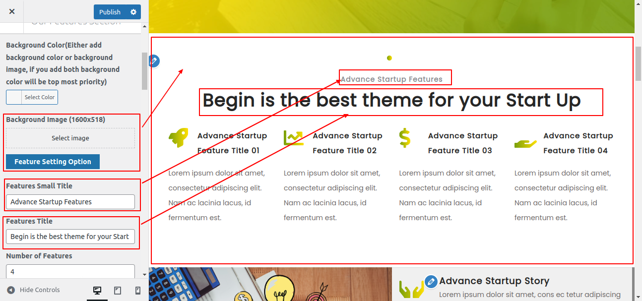 Go To Appearance >> Customize >> Theme Settings >> Our Features Section Section.