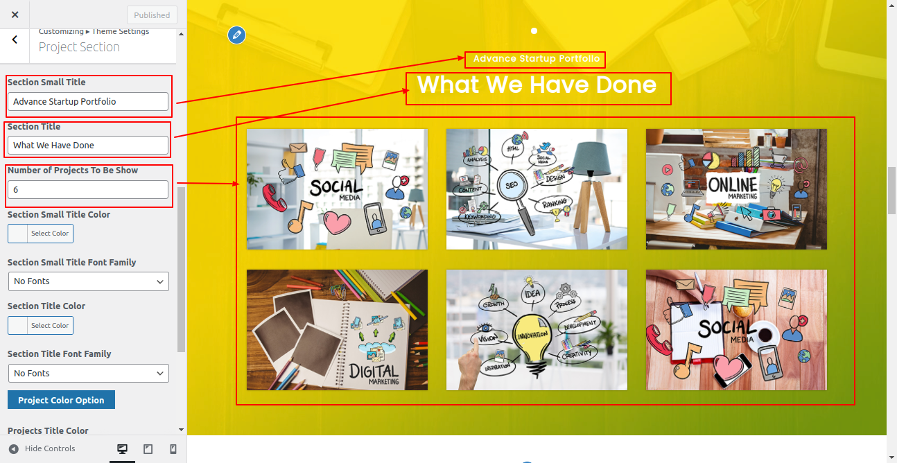 Go To Appearance >> Customize >> Theme Settings >> Project Section.