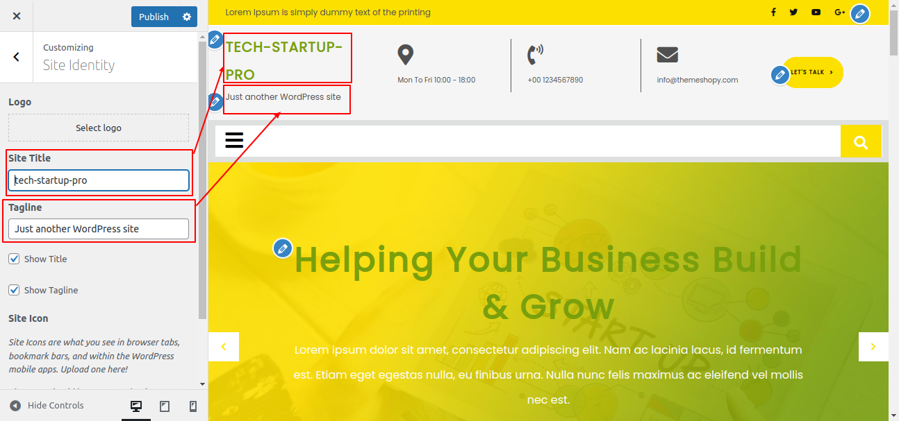 1. Go to Dashboard >> Appearance >> Customize >> Site identity.