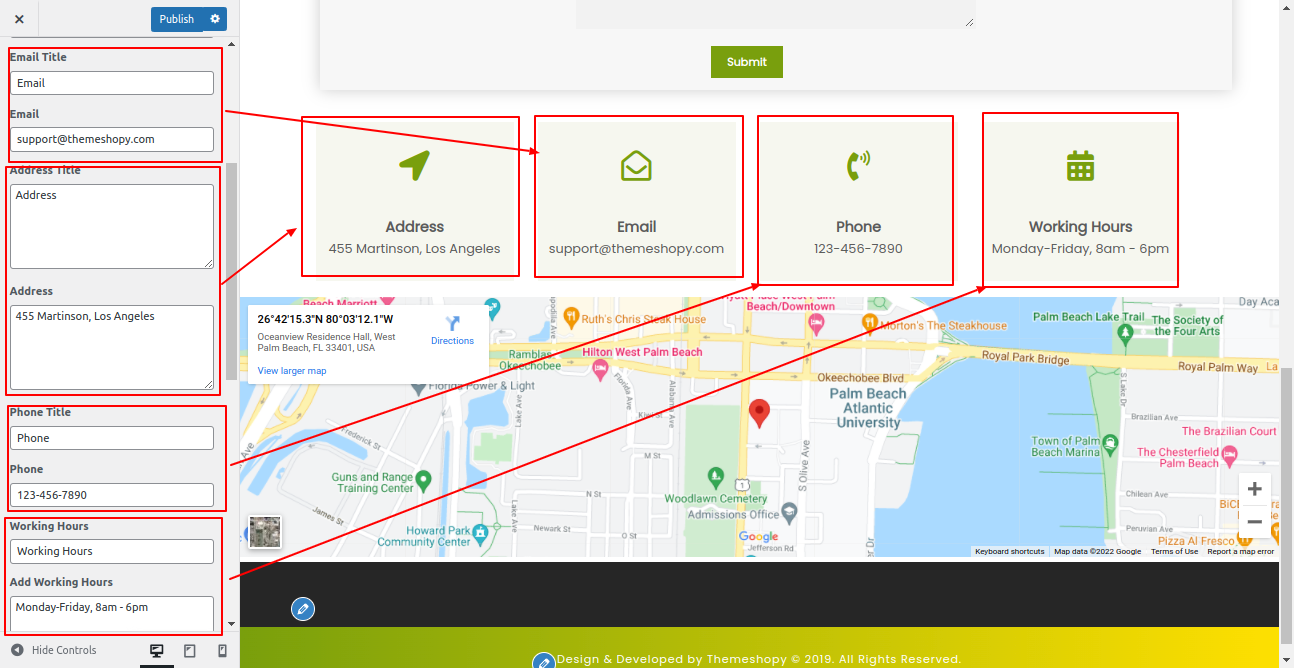 Go to Appearance >> Customize >> Theme Settings >> Contact.