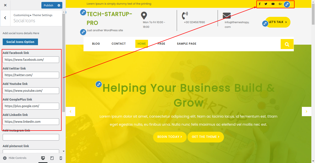 Go to Appearance >> Customize >> Theme Settings >> Social Icons.