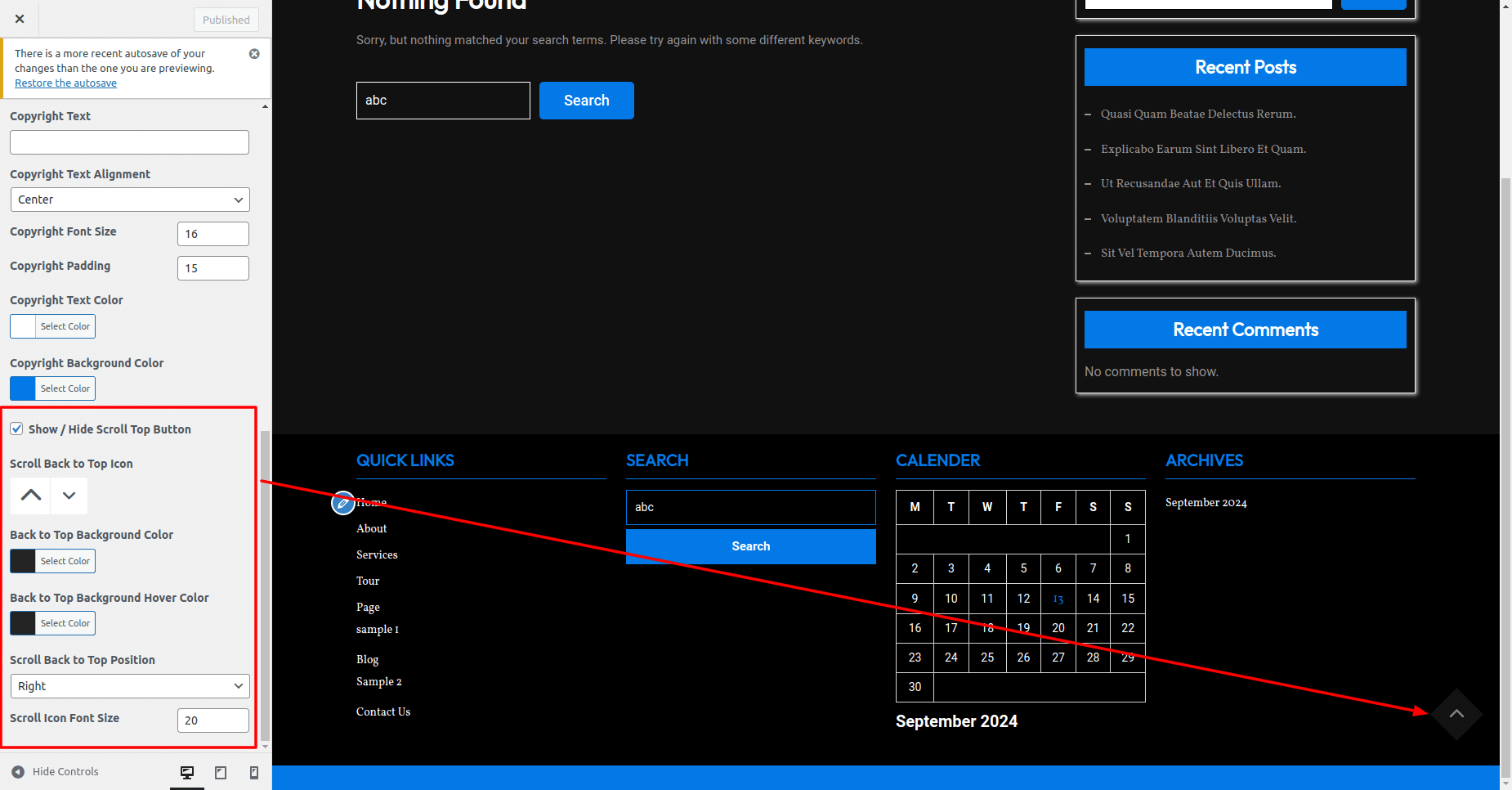 For show or hide Scroll Top Button, click twice on the checkbox and select the position for scroll top button, scroll top bg color and scroll top button font size etc .