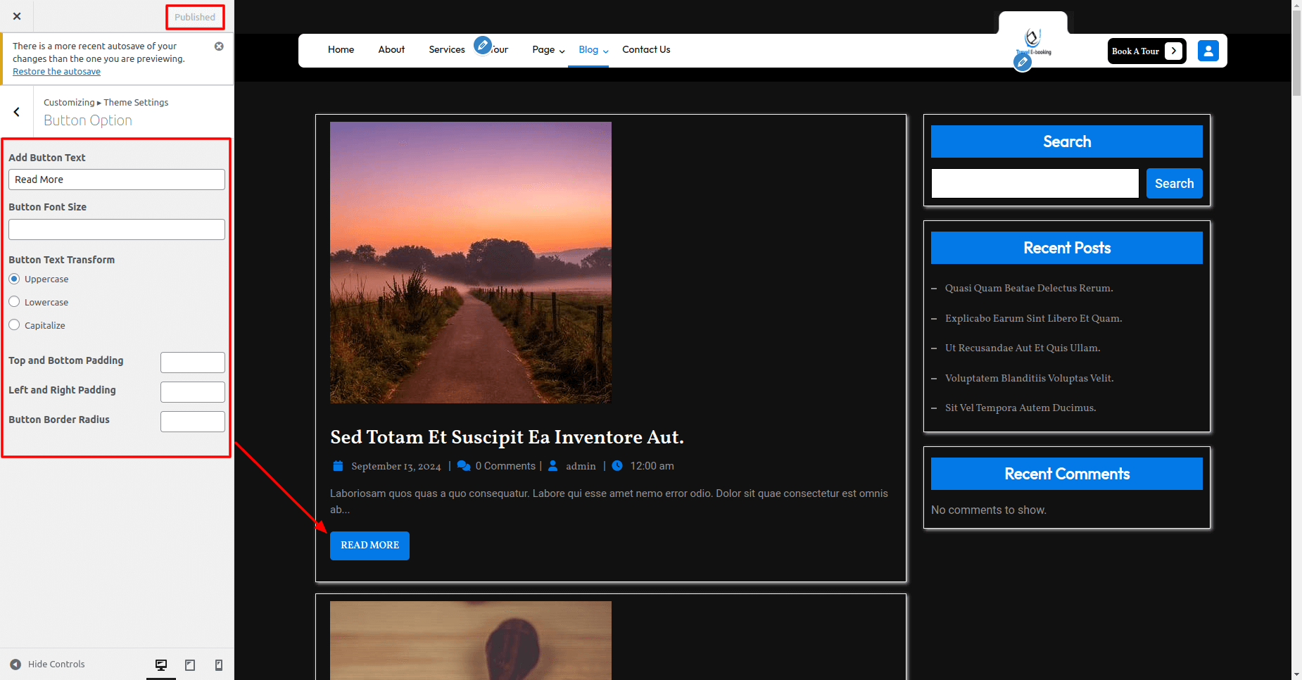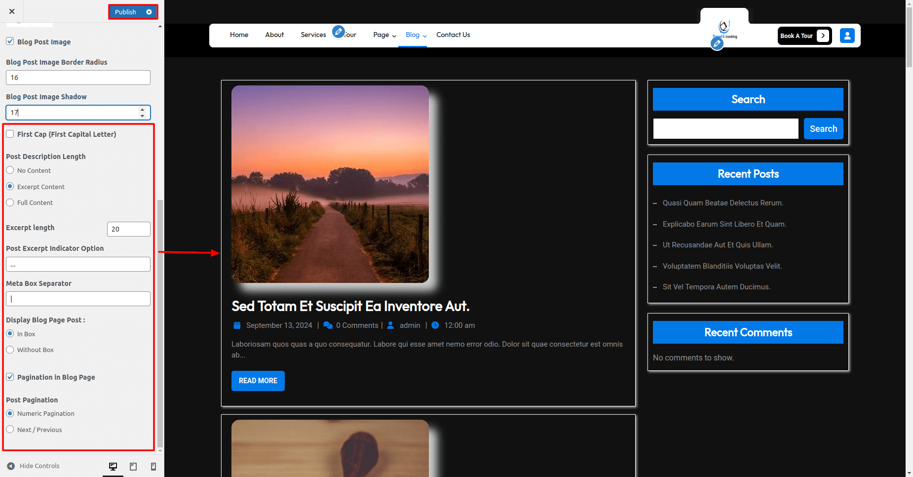 Here you can change excerpt length, Button Text, Button Font Size, Button Text Transform, Meta Box Separator, Display Blog Page Post etc .