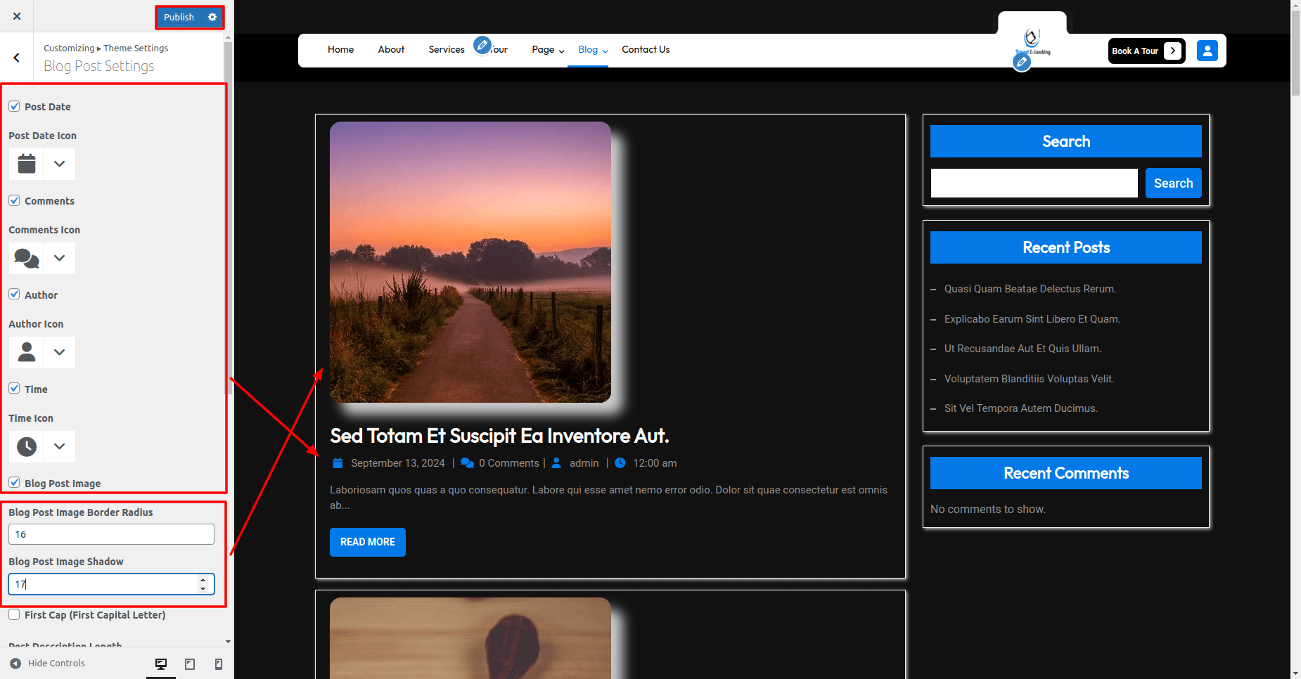 For blog page setting, you can show or hide post date, comments, author and time and its icon,also show/hide blog post image,change blog post image border radius and image shadow etc.