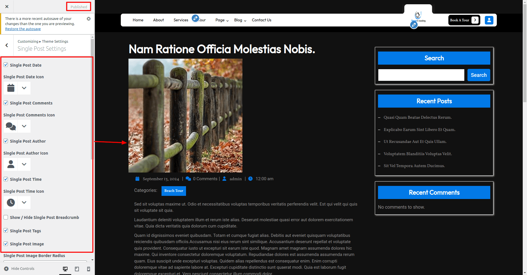 For Single Post Setting, you can show or hide single post date, comments author and time and its icon, also show/hide single post image, tags, breadcrumb, change blog post image border radius and image shadow etc.