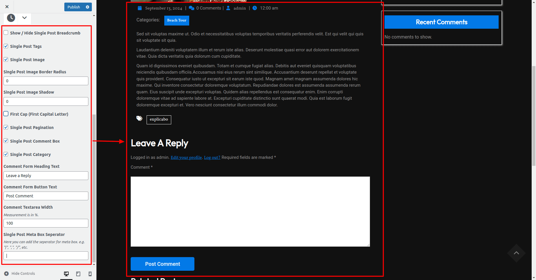 Here you can show/hide Pagination, Comment Box, Category, Comment Form Heading Text, Comment Form Button Text, Comment Textarea Width and Meta Box Seperator etc.