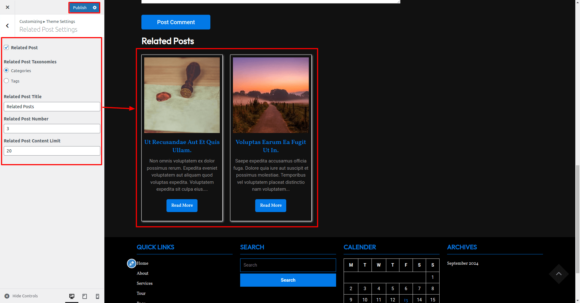 For Related Post Settings, you can show or hide Related Post, Related Post Taxonomies, Related Post Title, Related Post Number, Related Post Content Limit etc.