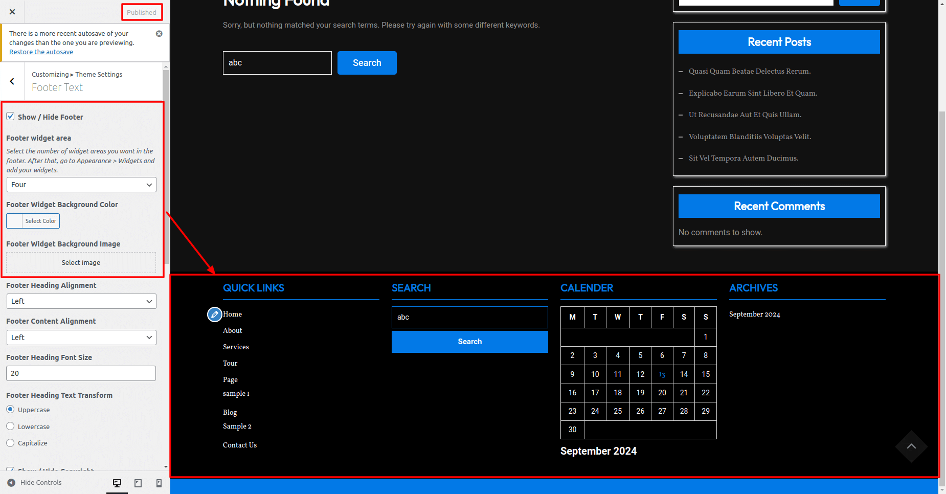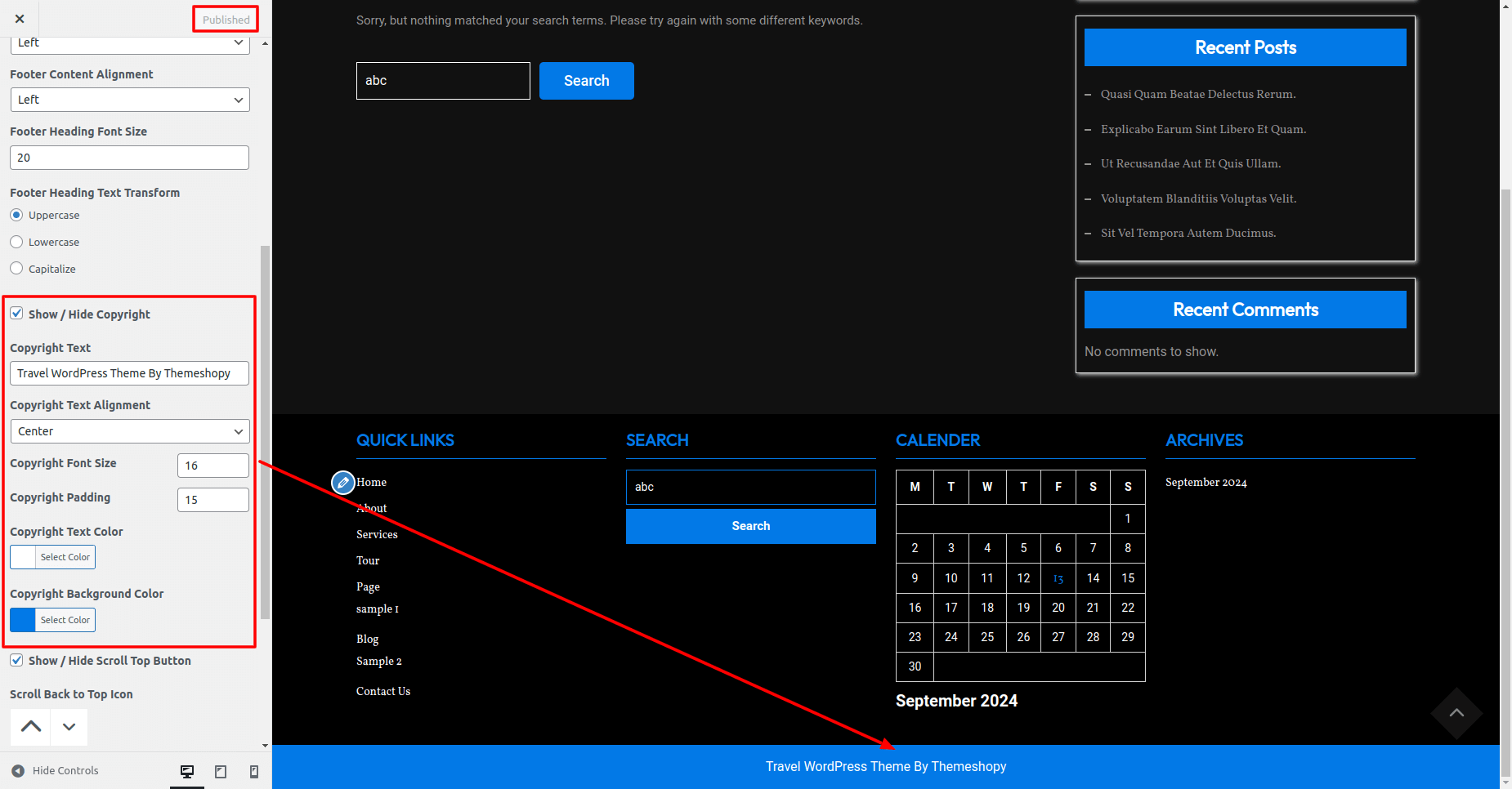 Once you add copyright text your footer text section will look like this.