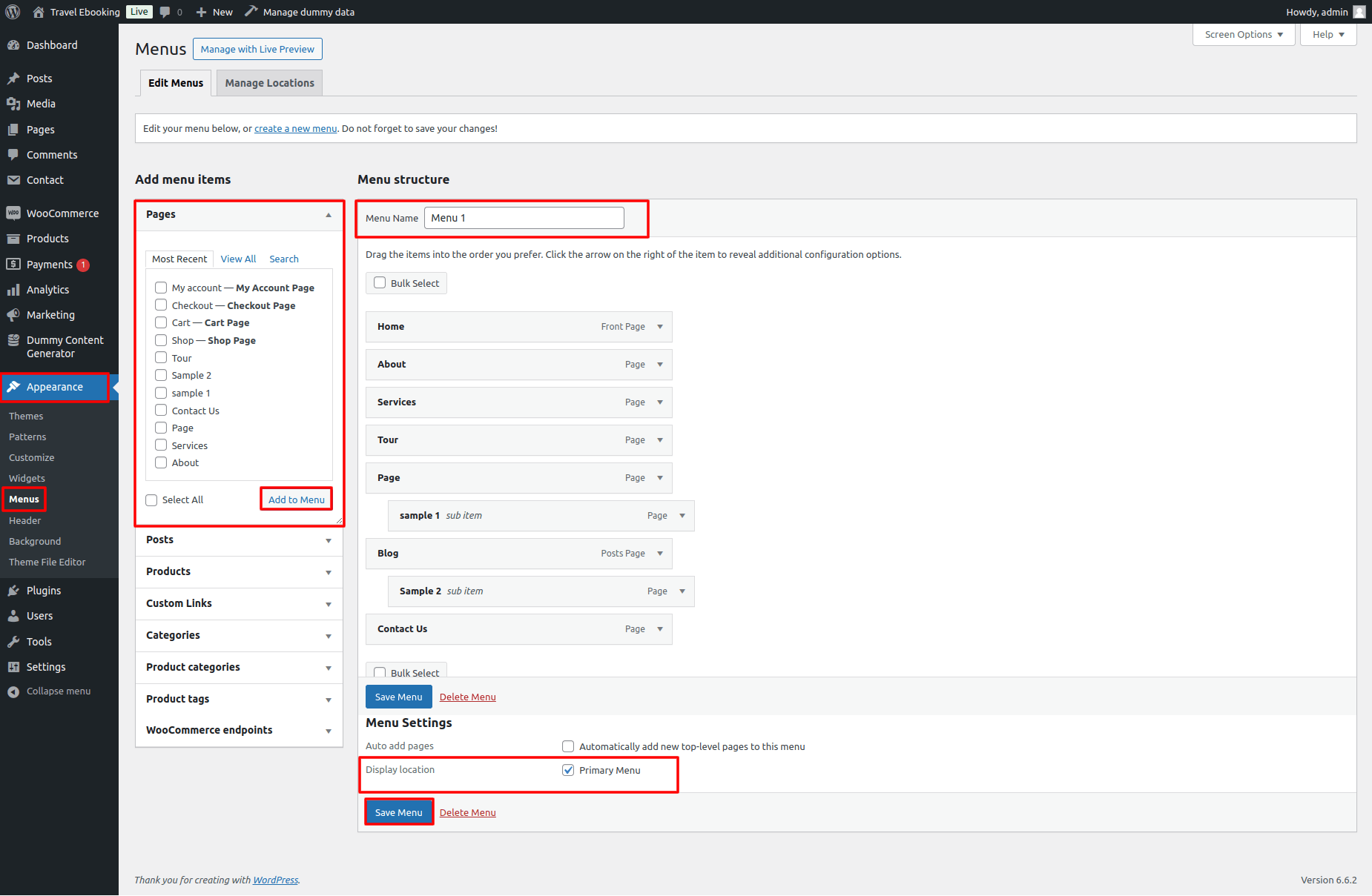 Once you have create menu. You need to add pages by selecting with checkboxes. After adding menu list you can arrange it by drag and drop.