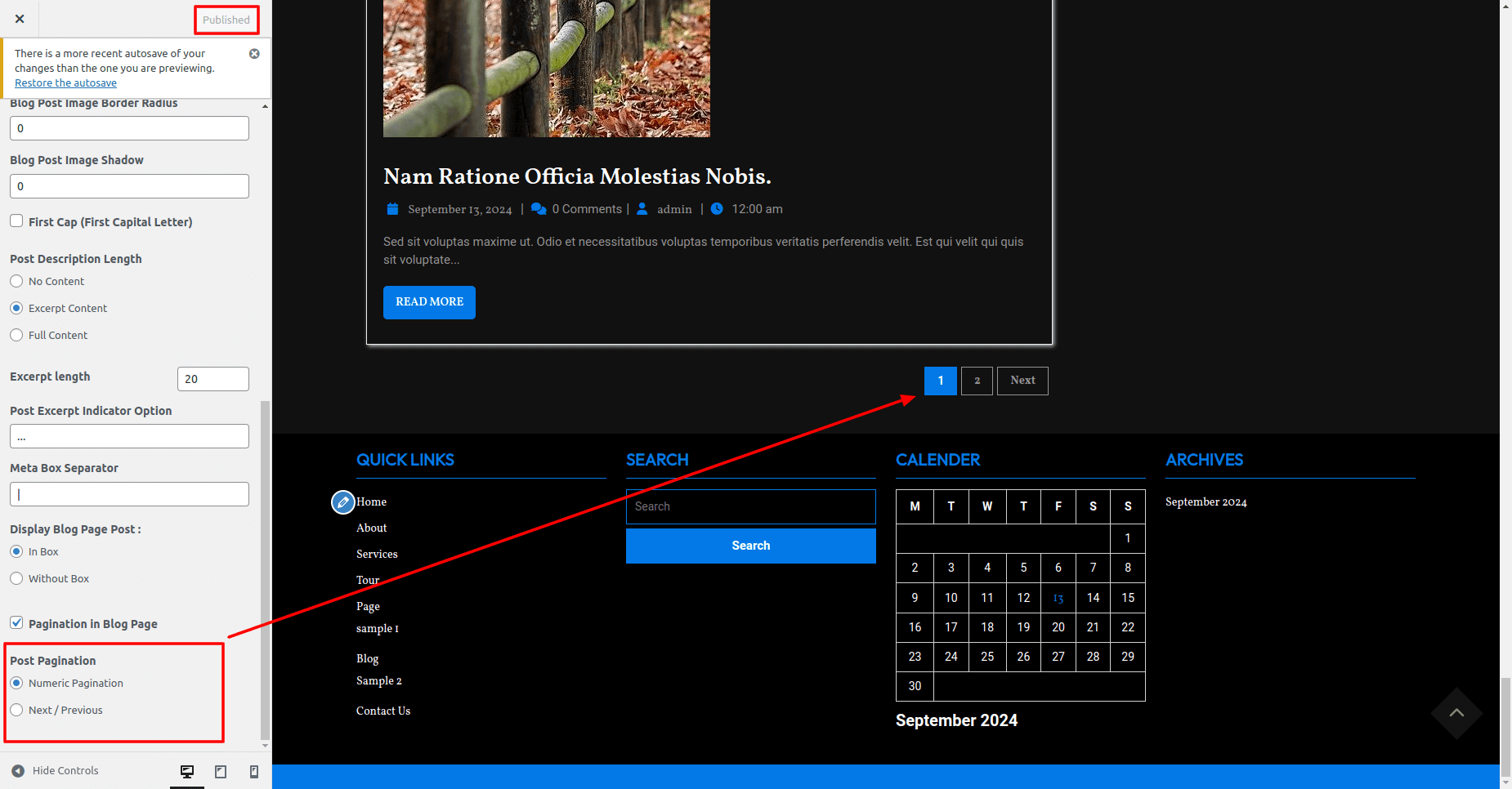 Here you can show/hide Pagination in Blog Page and Post Pagination type.