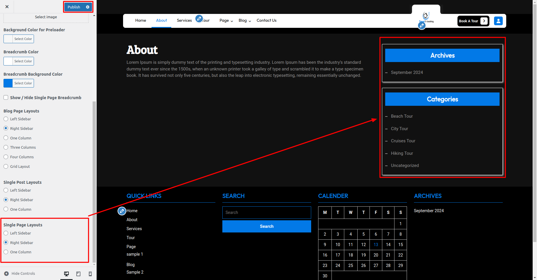 In Layout Settings, you can select the Single Page Layout Sidebar.