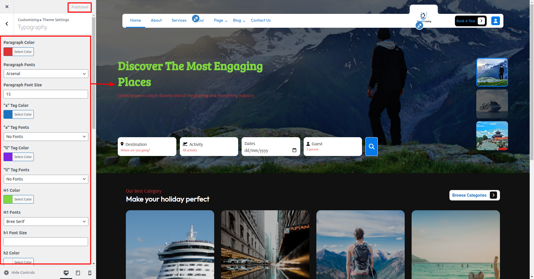 2. Fonts: Here you can change the Font Family of all Paragraph, 'a' tag, 'li' tag, H1, H2, H3, H4, H5 and H6 respectively.