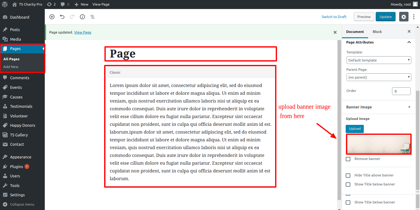 Go to Dashboard >> Pages >> Add New .Add all the information, then pick a banner. View the screenshot below for additional information.
