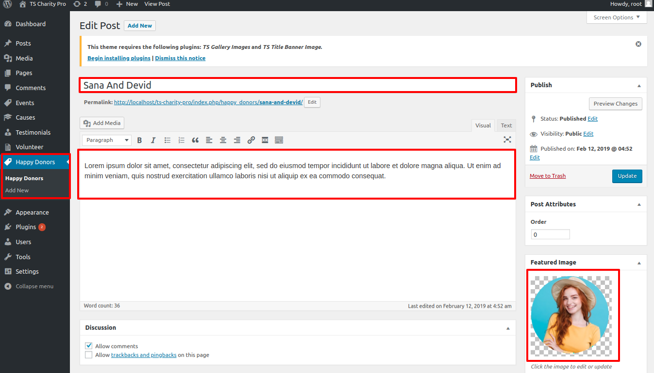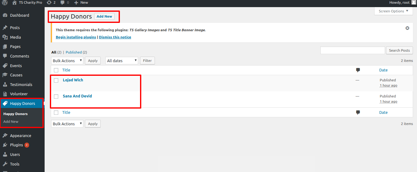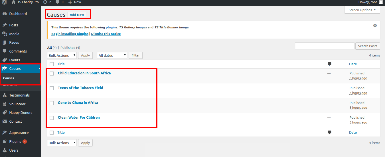 For this section you have to activate Ts Charity pro Post Types plugin(for more information refer to plugin section).