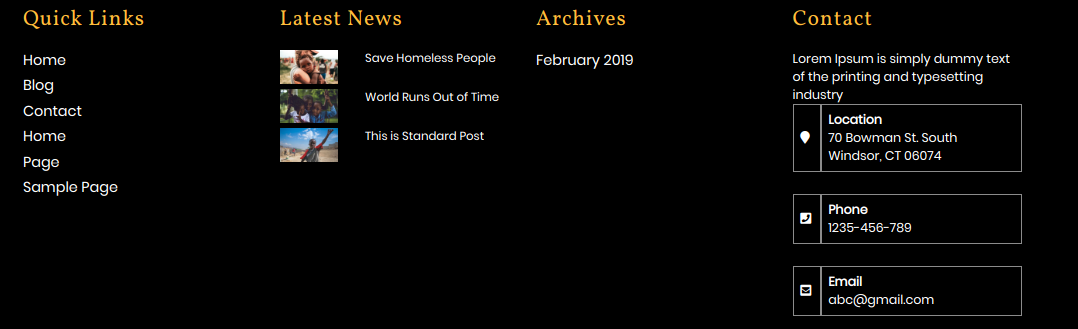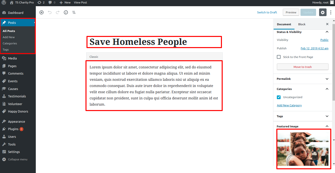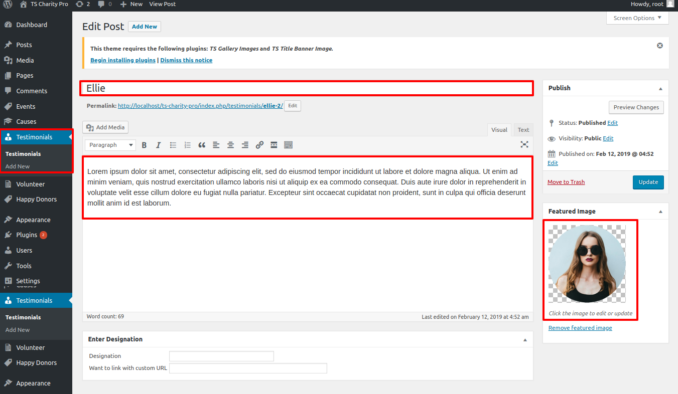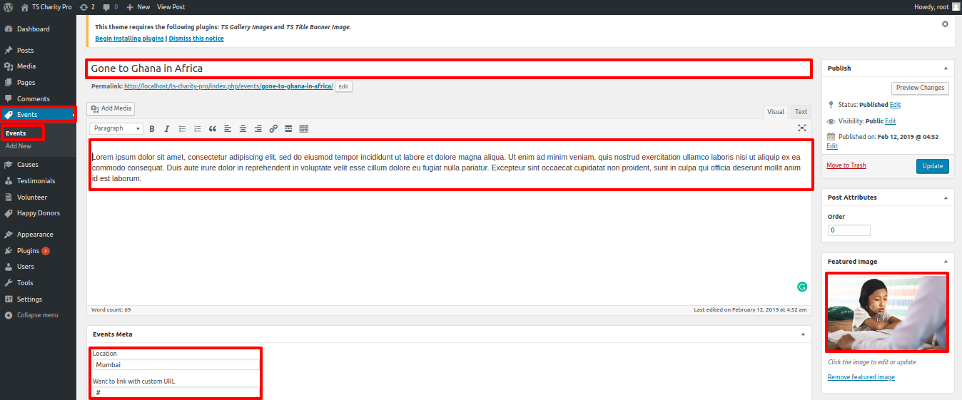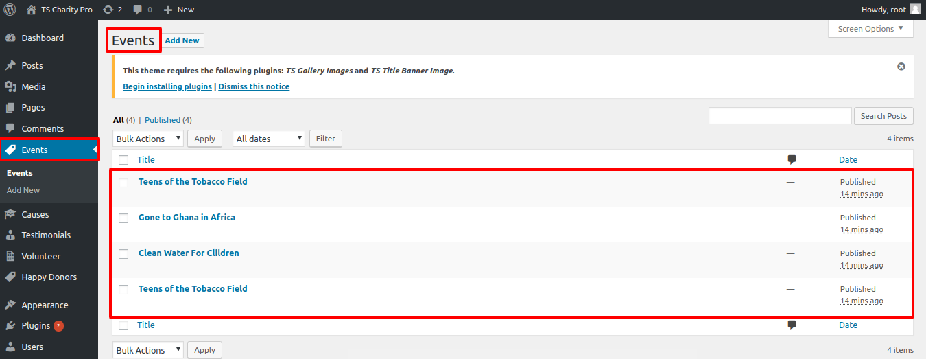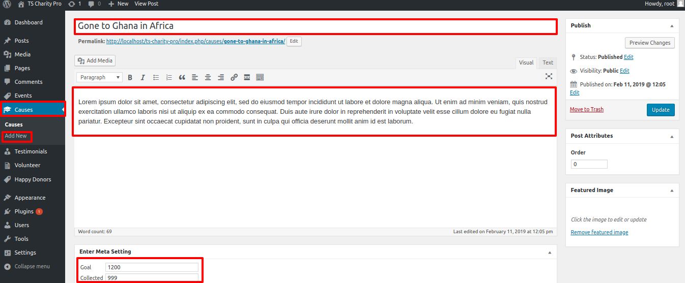 For this section you have to activate TS Charity pro Post Type plugin(for more information refer to plugin section).