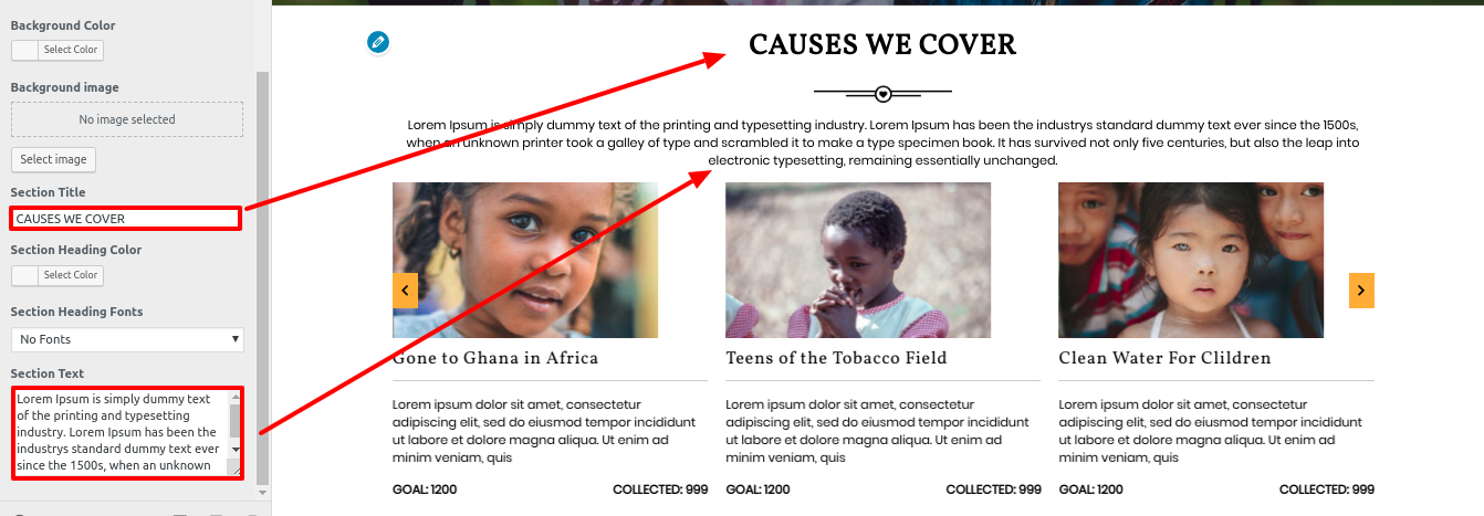 Go to Dashboard>>Appearance>>Customize>>Theme settings>>our Causes.