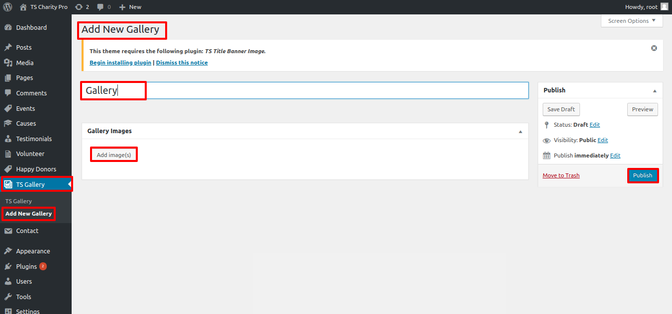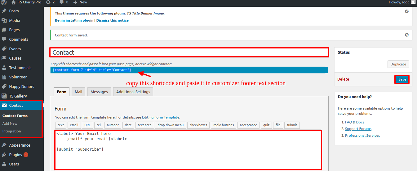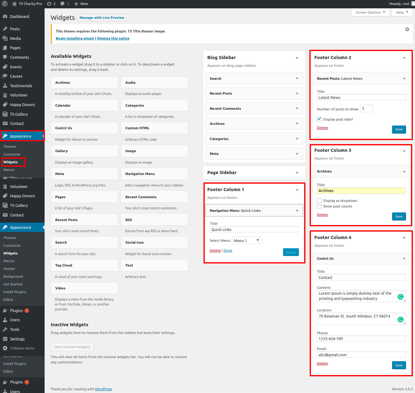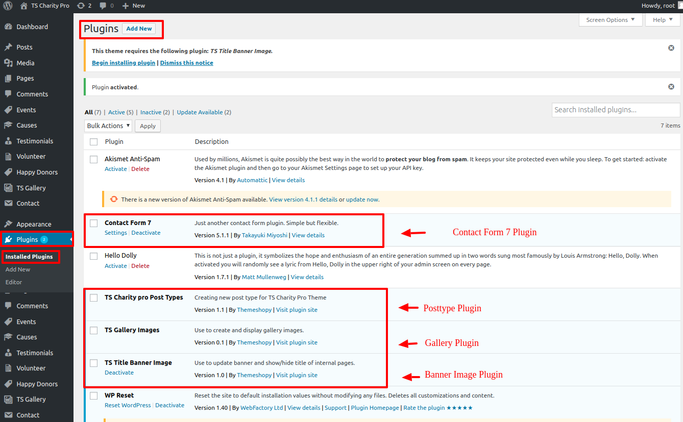The TS Charity Pro Post Types, TS Gallery Image, TS Title Banner Image, and Contact Form 7 plugins must be added to and activated in the Plugin area.